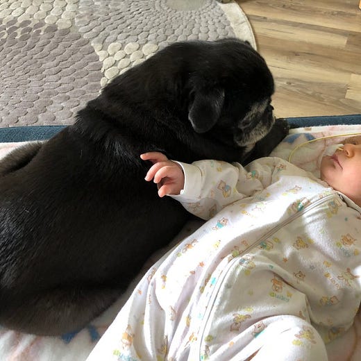 After some online research, we found a pug breeder in Bakersfield. We booked a time to meet her new litter of puppies and made the three-hour drive from our home in Santa Barbara for an evening visit. Shortly after we arrived, she suggested we sit on the floor of her living room and she would bring the puppies in. Moments later, five tiny pug puppies were bouncing around playing in front of us. It was exactly as adorable as you might imagine. Eventually, one of the fawn-colored male puppies made his way toward me. I gently picked him up, his tiny body not even as long as my hand, and he fell asleep almost instantly. I was sold and we left the house with a slightly lower net worth and we looked forward to coming back to pick him up when he was a few weeks older.